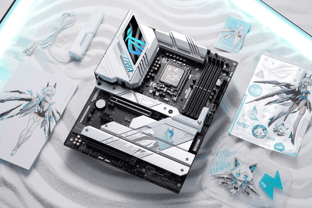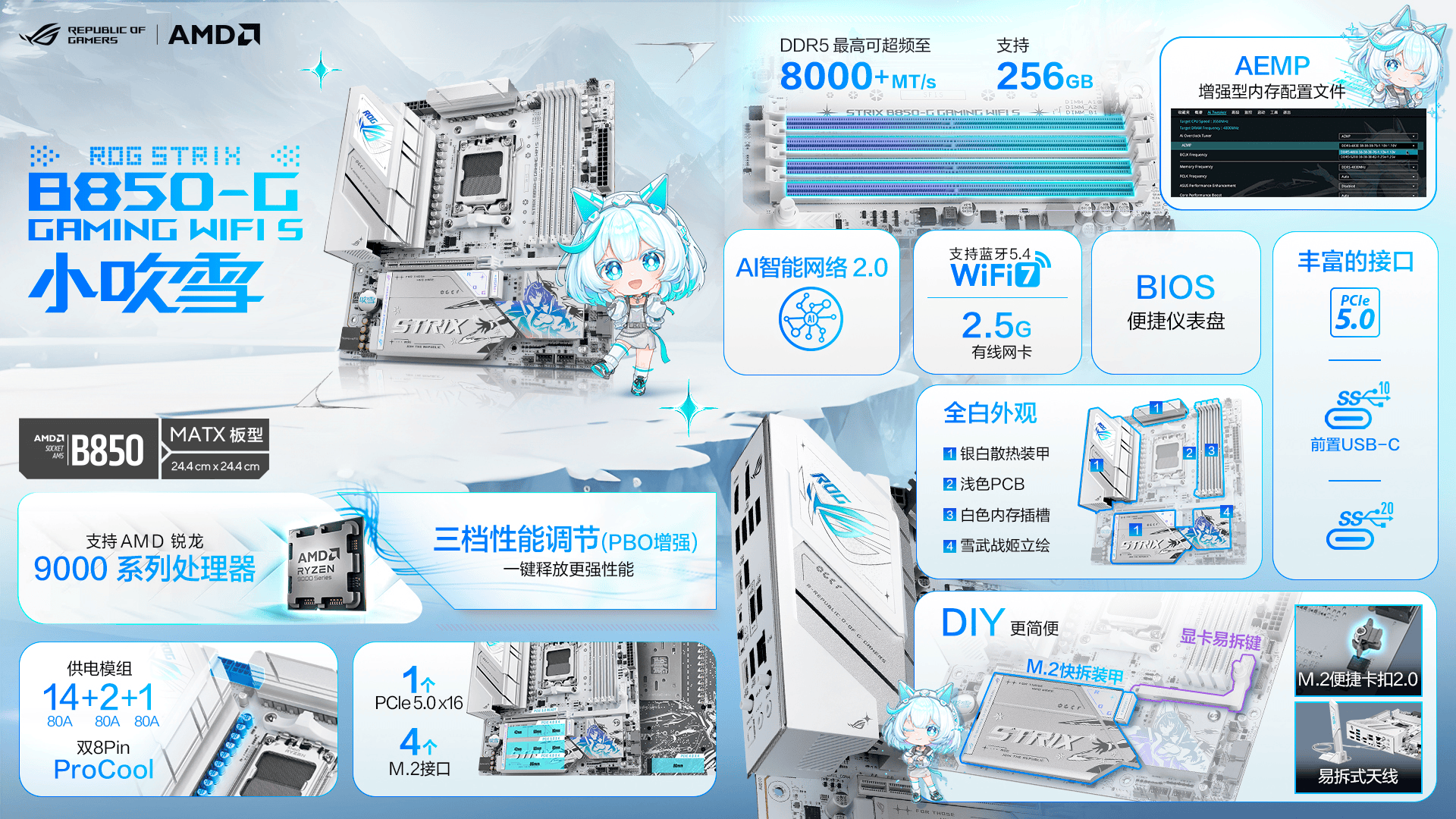 华硕ROG B850小吹雪主板身披大面积银白装甲,还有白色内存插槽和浅色PCB,并加入大量雪武战姬主题元素,再配合上支持神光同步的ROG LOGO,树立次元美学新标杆